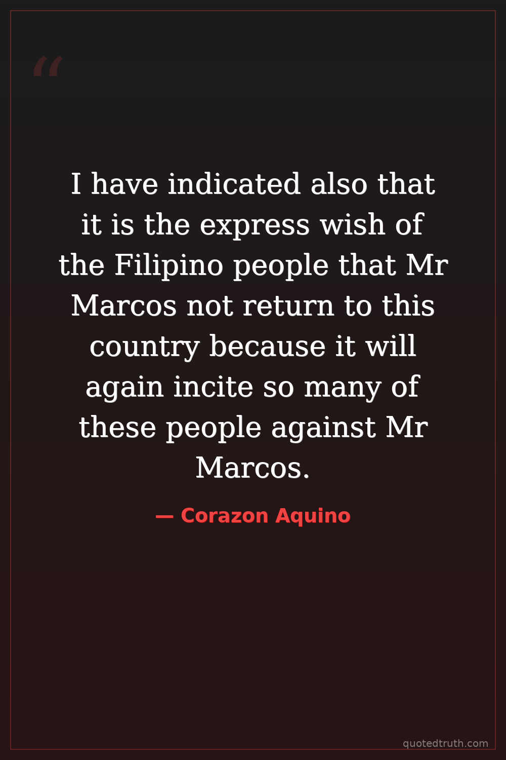 I have indicated also that it is the express wish of the Filipino people that Mr Marcos not return to this country because it will again incite so many of these people against Mr Marcos.