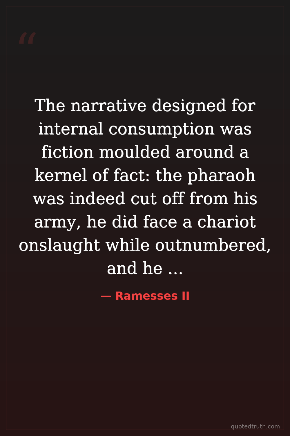 The narrative designed for internal consumption was fiction moulded around a kernel of fact: the pharaoh was indeed cut off from his army, he did face a chariot onslaught while outnumbered, and he did inflict casualties. He lost, but so what? As politics continues to show, even dubious achievements can become triumphs after sufficient amplification and trumpeting.