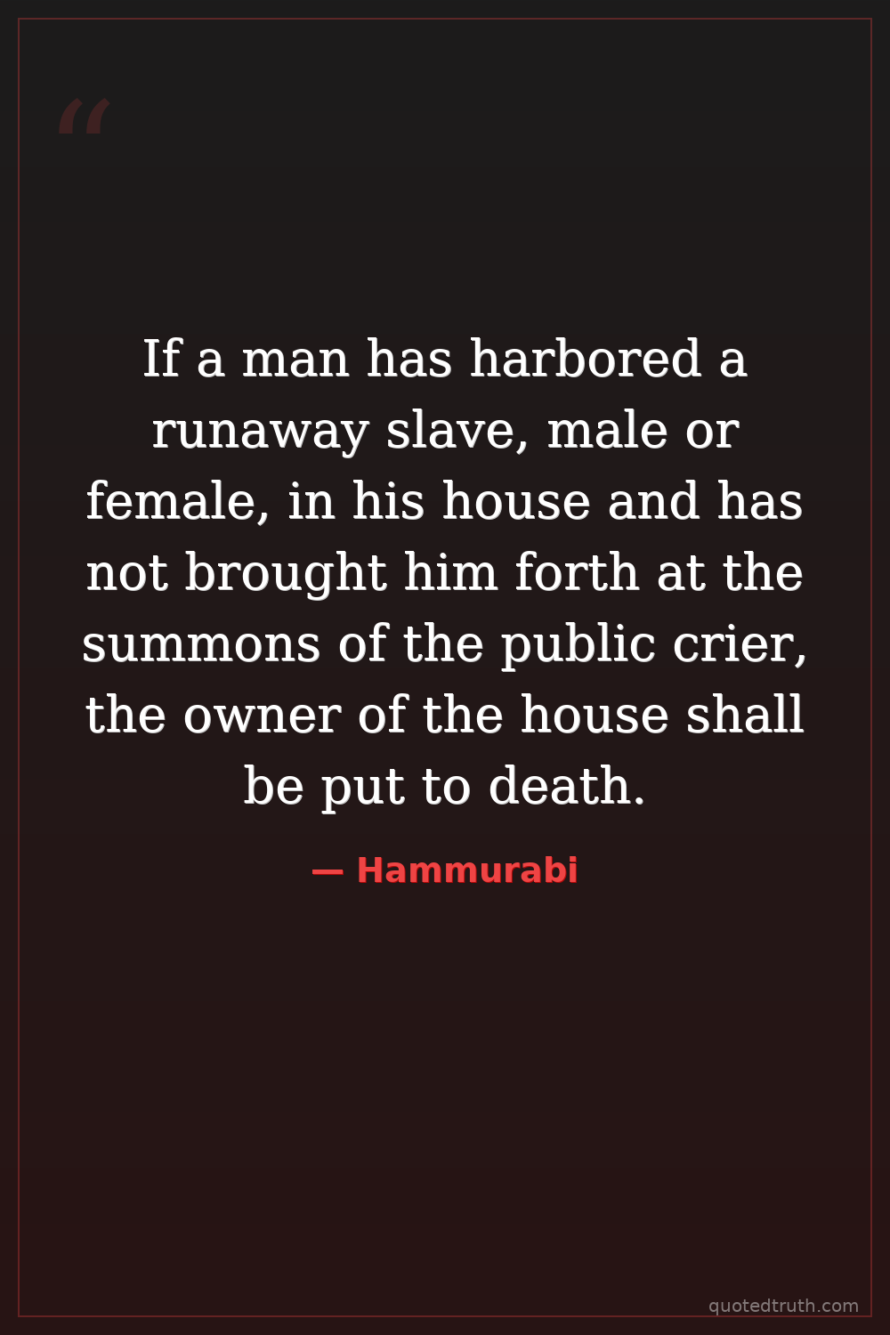 If a man has harbored a runaway slave, male or female, in his house and has not brought him forth at the summons of the public crier, the owner of the house shall be put to death.