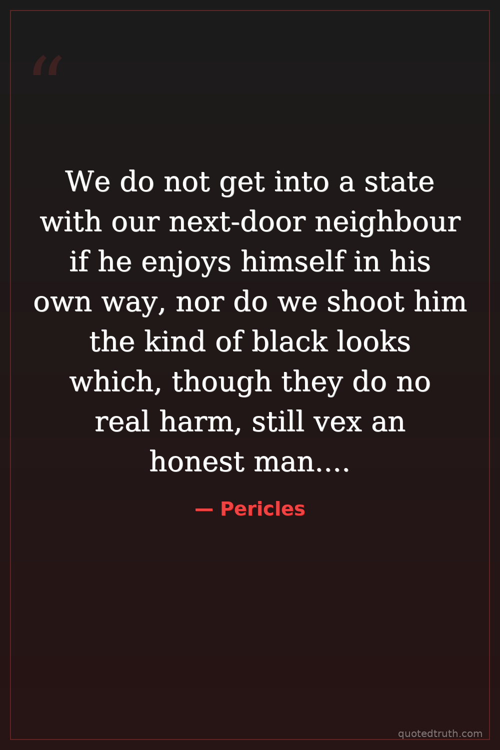 We do not get into a state with our next-door neighbour if he enjoys himself in his own way, nor do we shoot him the kind of black looks which, though they do no real harm, still vex an honest man. We are free and open in our political life; in our private lives we are not suspicious of one another, and do not get angry with our neighbour for acting as he pleases, nor do we cast sour looks at him, which though harmless, are unpleasant.