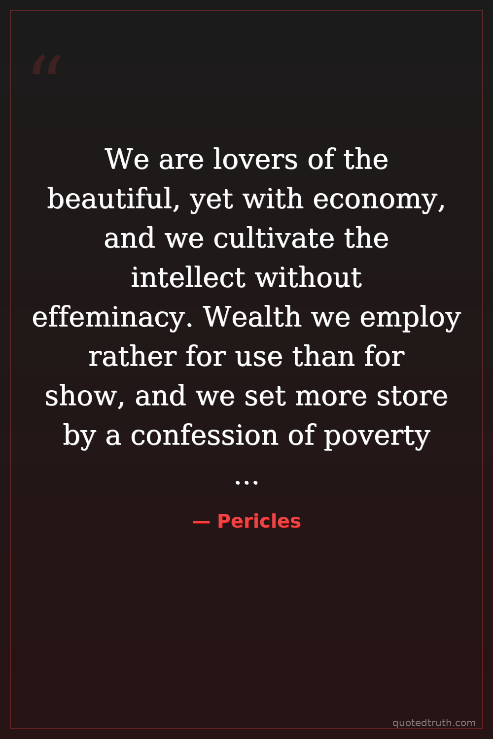 We are lovers of the beautiful, yet with economy, and we cultivate the intellect without effeminacy. Wealth we employ rather for use than for show, and we set more store by a confession of poverty than by a vaunt of riches.
