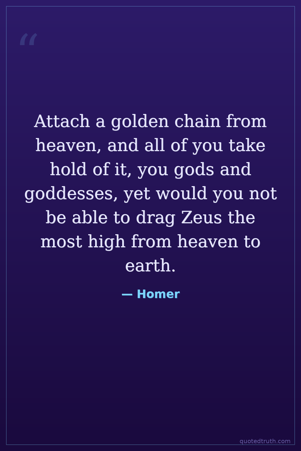 Attach a golden chain from heaven, and all of you take hold of it, you gods and goddesses, yet would you not be able to drag Zeus the most high from heaven to earth.
