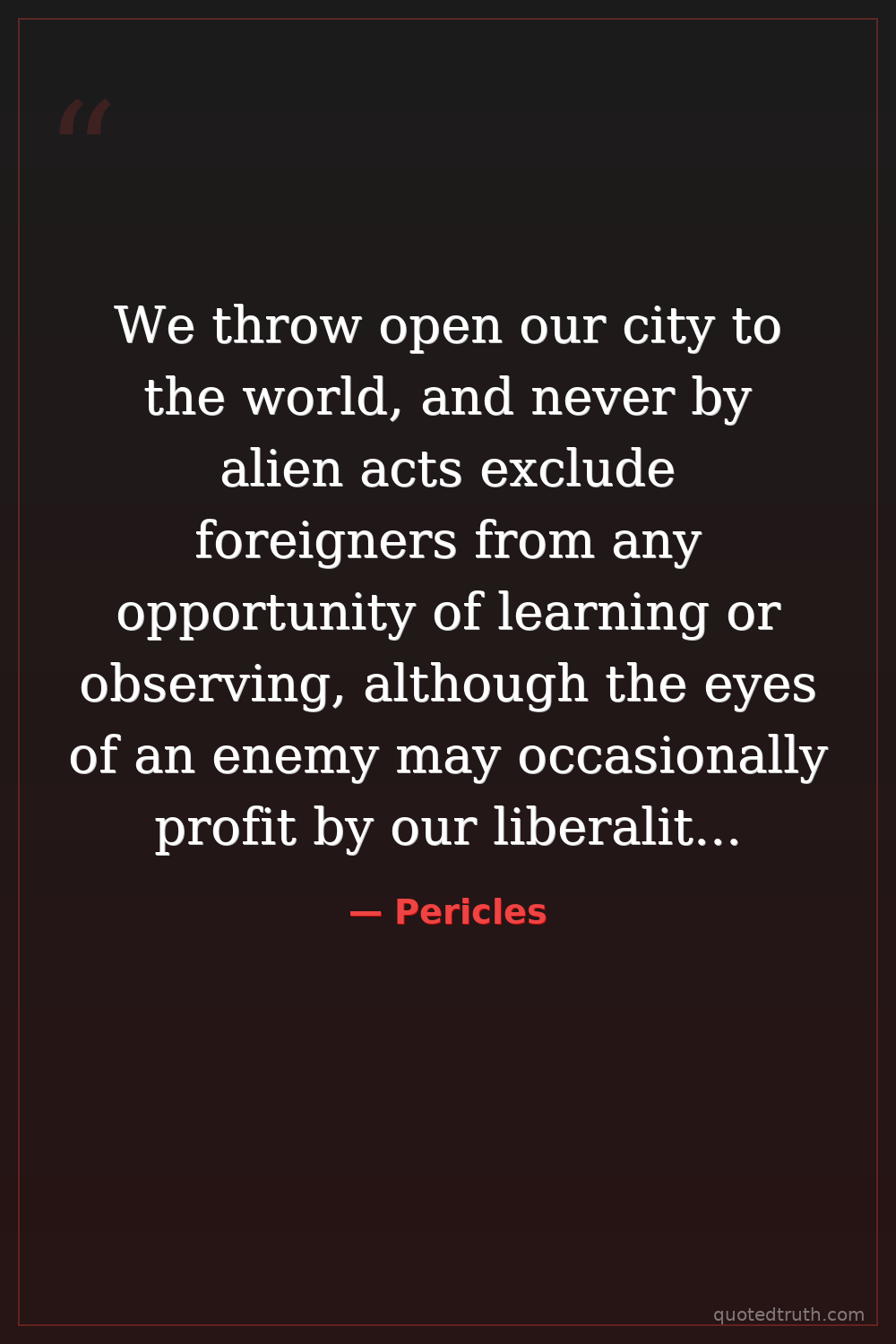We throw open our city to the world, and never by alien acts exclude foreigners from any opportunity of learning or observing, although the eyes of an enemy may occasionally profit by our liberality; trusting less in system and policy than to the native spirit of our citizens.