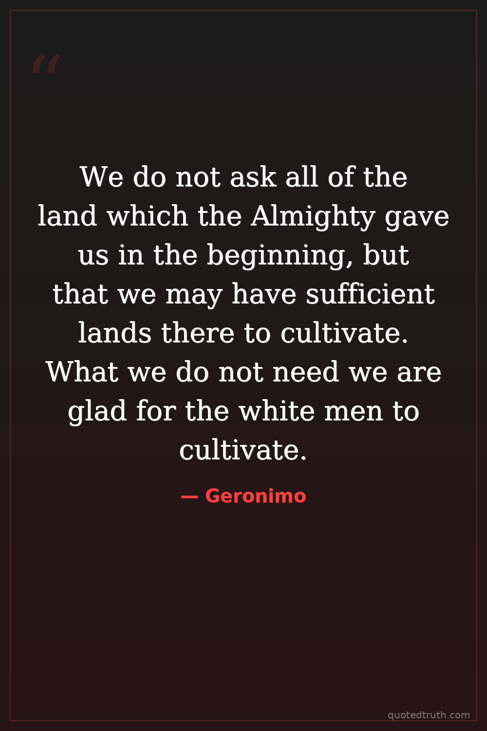 We do not ask all of the land which the Almighty gave us in the beginning, but that we may have sufficient lands there to cultivate. What we do not need we are glad for the white men to cultivate.