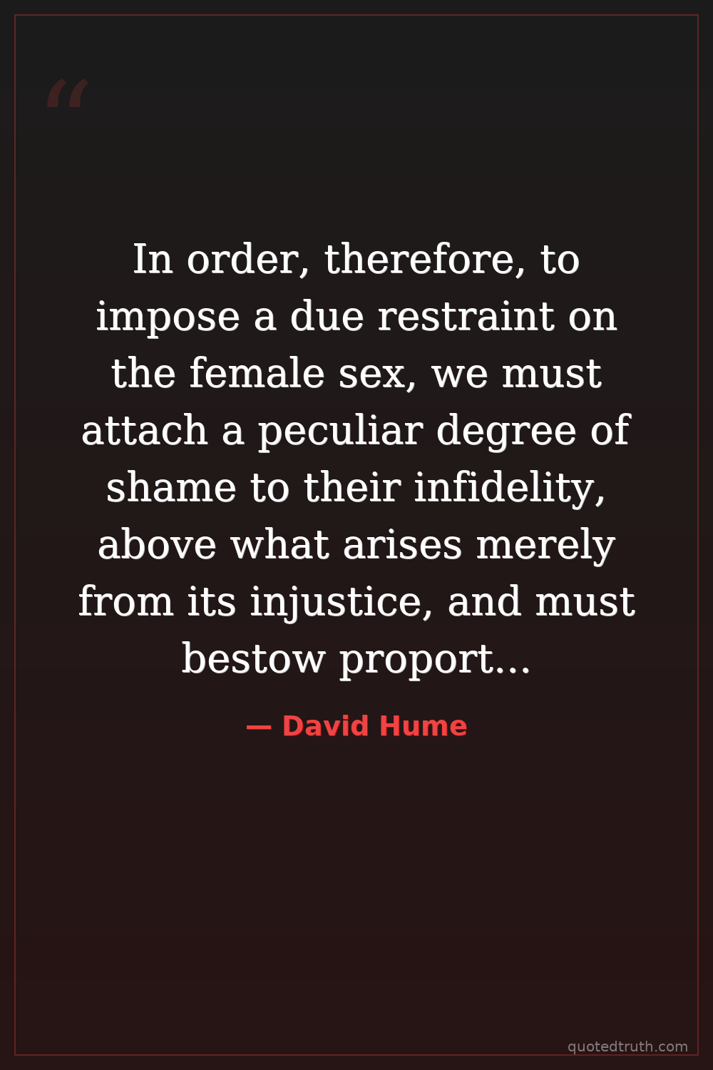 In order, therefore, to impose a due restraint on the female sex, we must attach a peculiar degree of shame to their infidelity, above what arises merely from its injustice, and must bestow proportionable praises on their chastity. — David Hume Early Modern Empiricism, skepticism