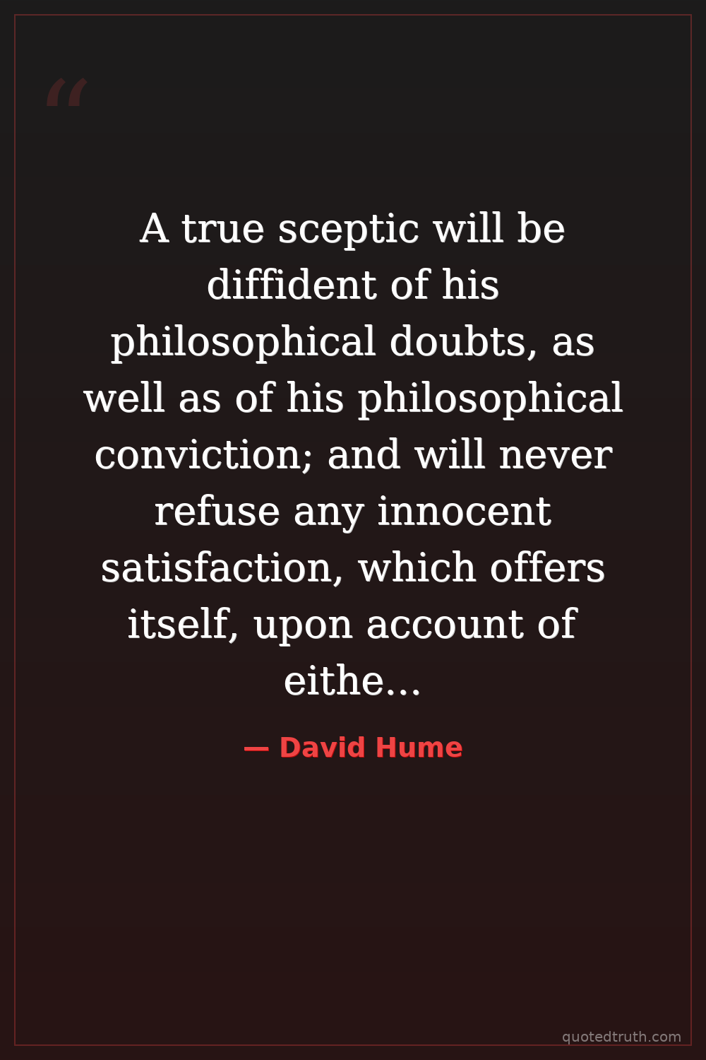 A true sceptic will be diffident of his philosophical doubts, as well as of his philosophical conviction; and will never refuse any innocent satisfaction, which offers itself, upon account of either of them.