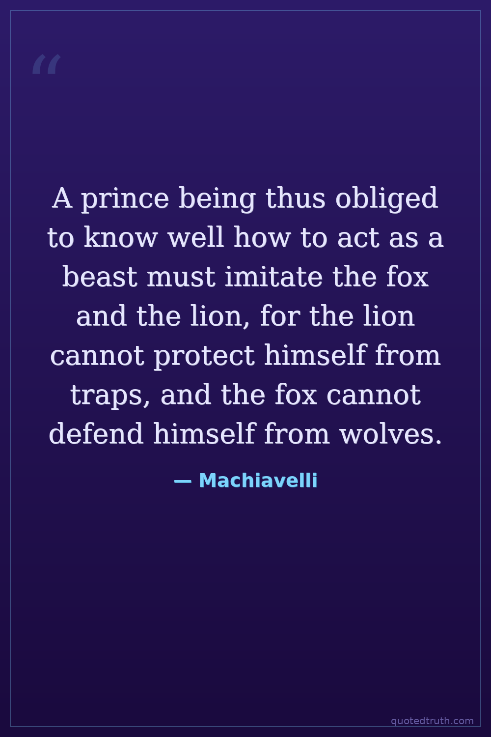 A prince being thus obliged to know well how to act as a beast must imitate the fox and the lion, for the lion cannot protect himself from traps, and the fox cannot defend himself from wolves.
