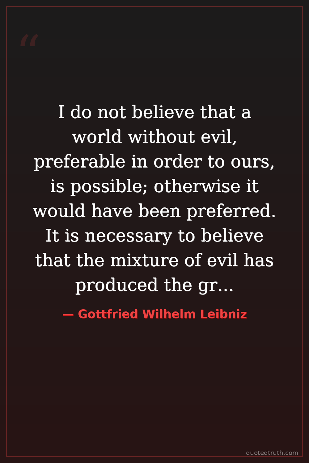 I do not believe that a world without evil, preferable in order to ours, is possible; otherwise it would have been preferred. It is necessary to believe that the mixture of evil has produced the greatest possible good: otherwise the evil would not have been permitted.