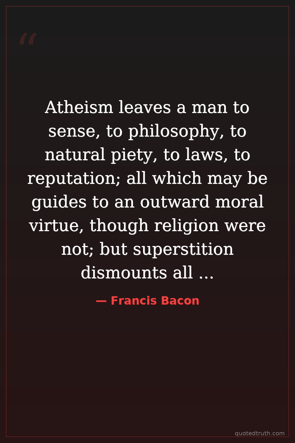 Atheism leaves a man to sense, to philosophy, to natural piety, to laws, to reputation; all which may be guides to an outward moral virtue, though religion were not; but superstition dismounts all these, and erecteth an absolute monarchy in the minds of men.