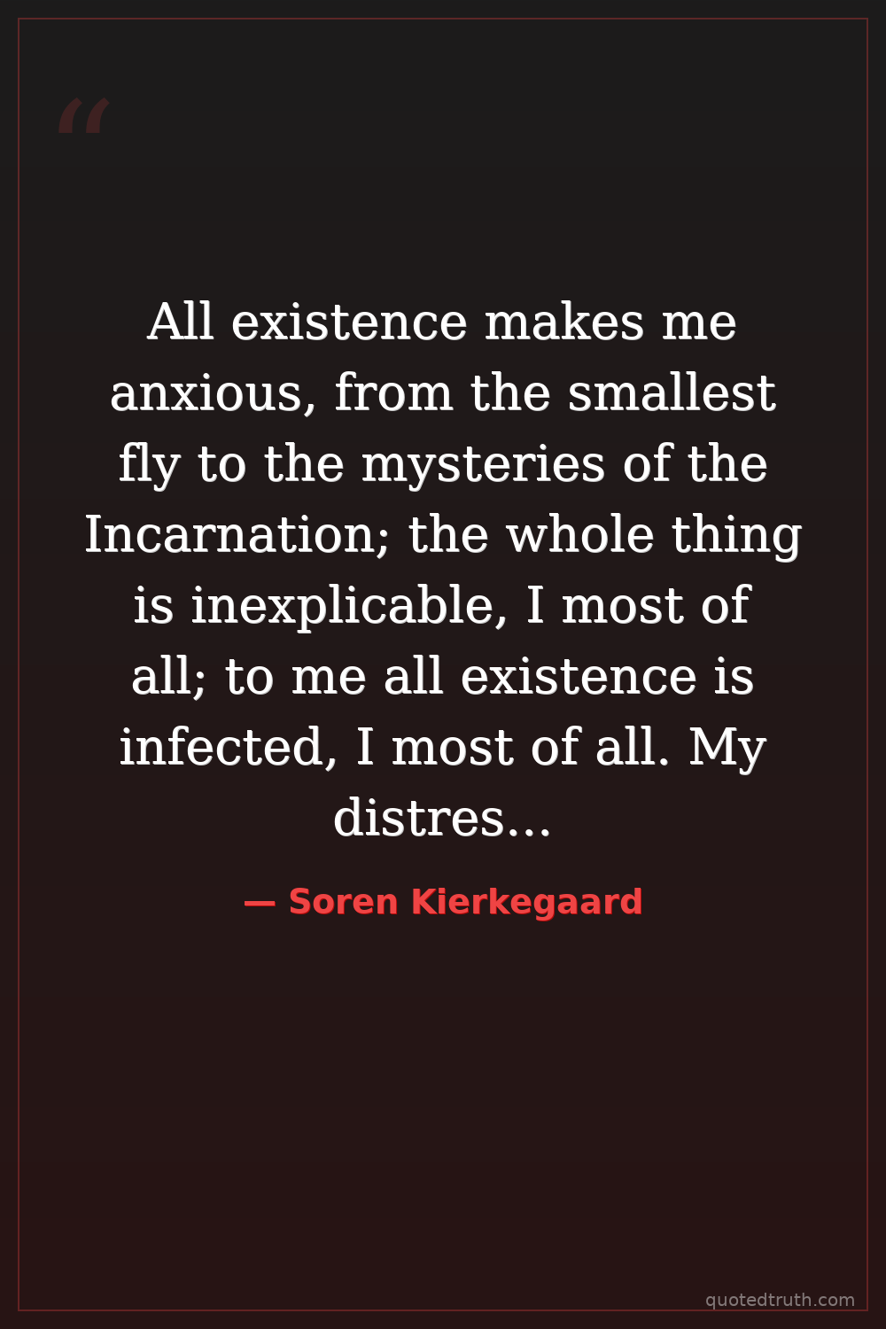 All existence makes me anxious, from the smallest fly to the mysteries of the Incarnation; the whole thing is inexplicable, I most of all; to me all existence is infected, I most of all. My distress is enormous, boundless; no one knows it except God in heaven, and he will not console me...