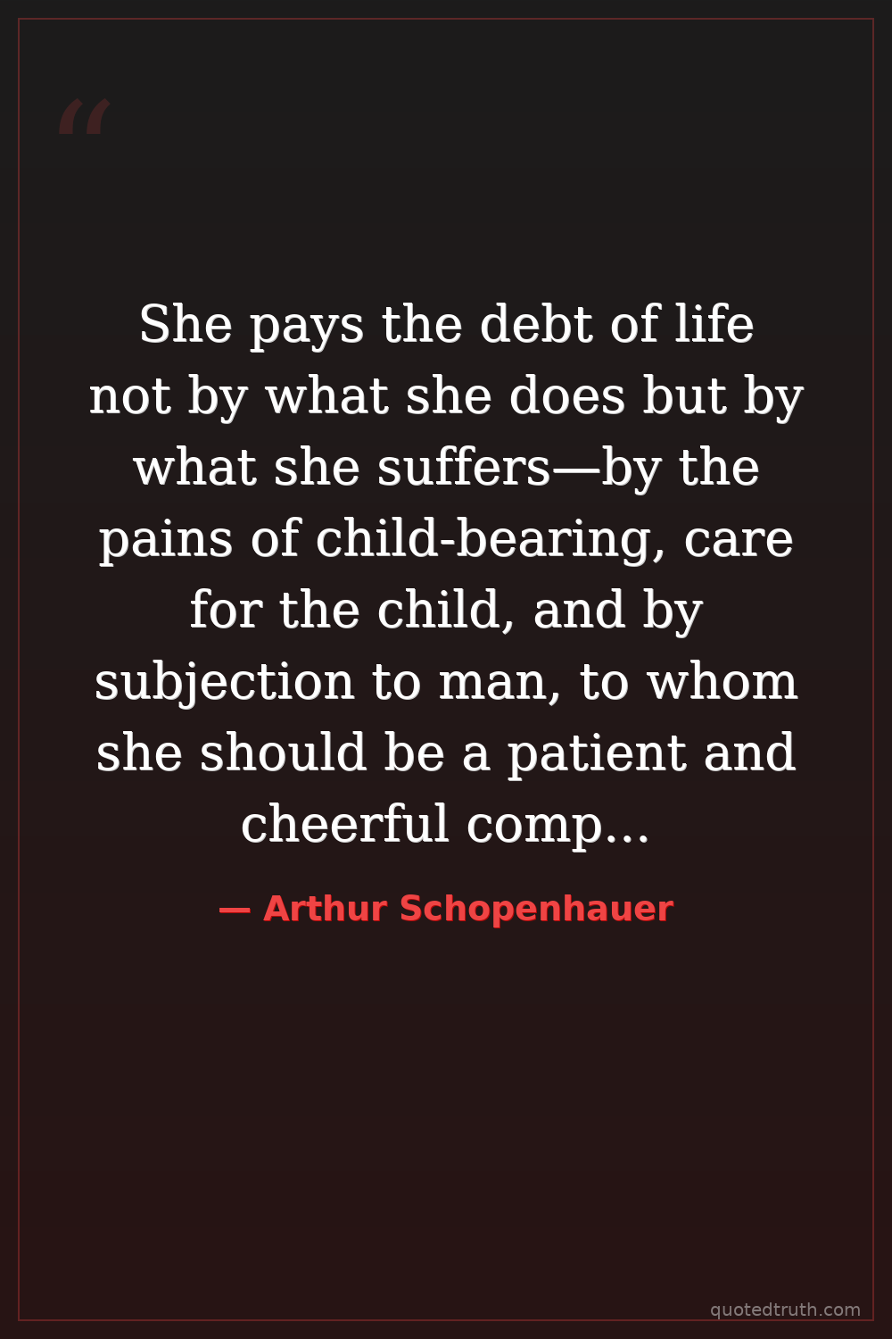 She pays the debt of life not by what she does but by what she suffers—by the pains of child-bearing, care for the child, and by subjection to man, to whom she should be a patient and cheerful companion.