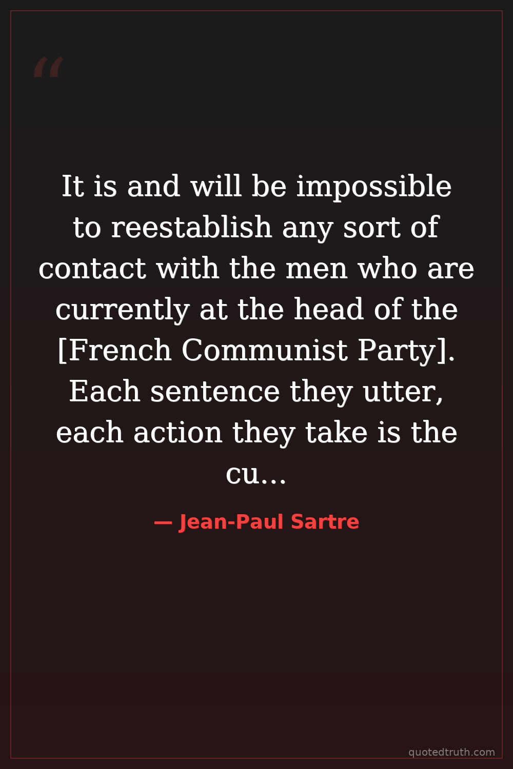 It is and will be impossible to reestablish any sort of contact with the men who are currently at the head of the [French Communist Party]. Each sentence they utter, each action they take is the culmination of 30 years of lies and sclerosis. — Jean-Paul Sartre Modern Existentialism