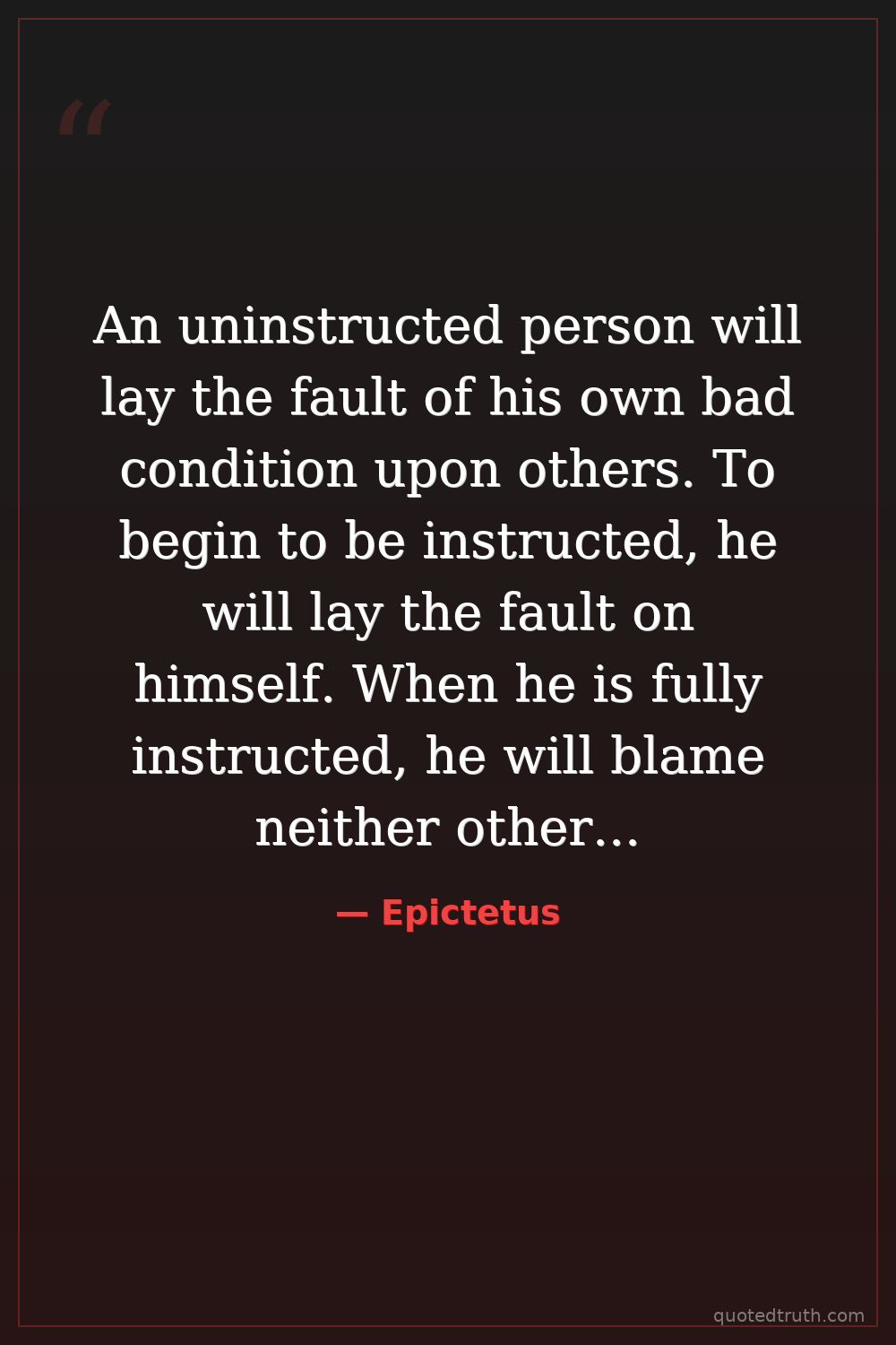 An uninstructed person will lay the fault of his own bad condition upon others. To begin to be instructed, he will lay the fault on himself. When he is fully instructed, he will blame neither others nor himself.