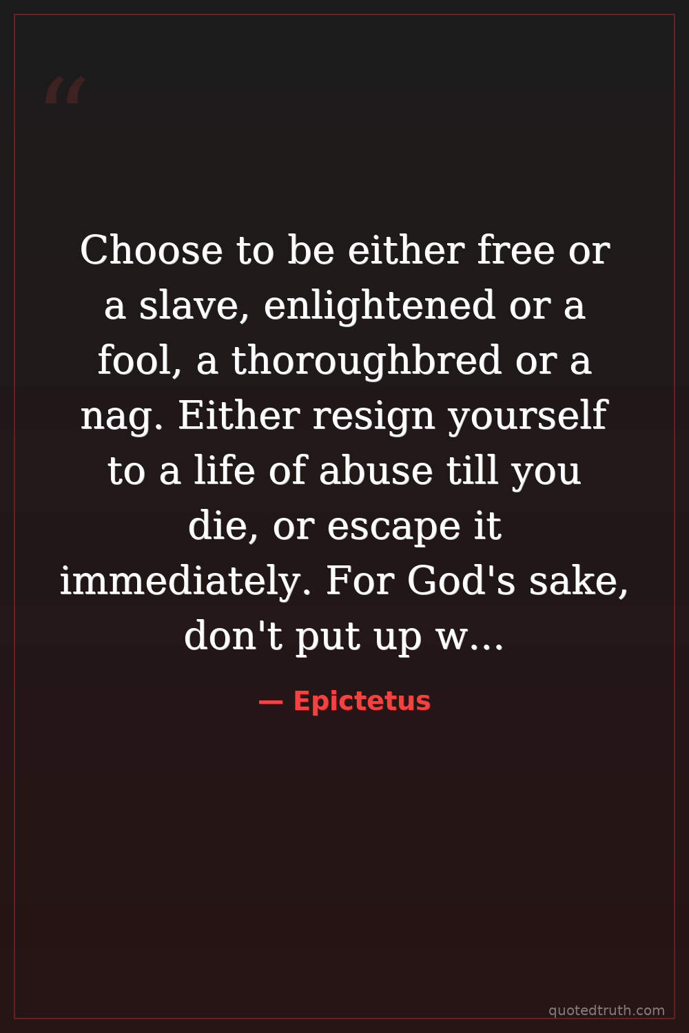 Choose to be either free or a slave, enlightened or a fool, a thoroughbred or a nag. Either resign yourself to a life of abuse till you die, or escape it immediately. For God's sake, don't put up with years of abuse, and then change your mind! This humiliation can be avoided before it begins: just decide now what you think is truly good and bad.
