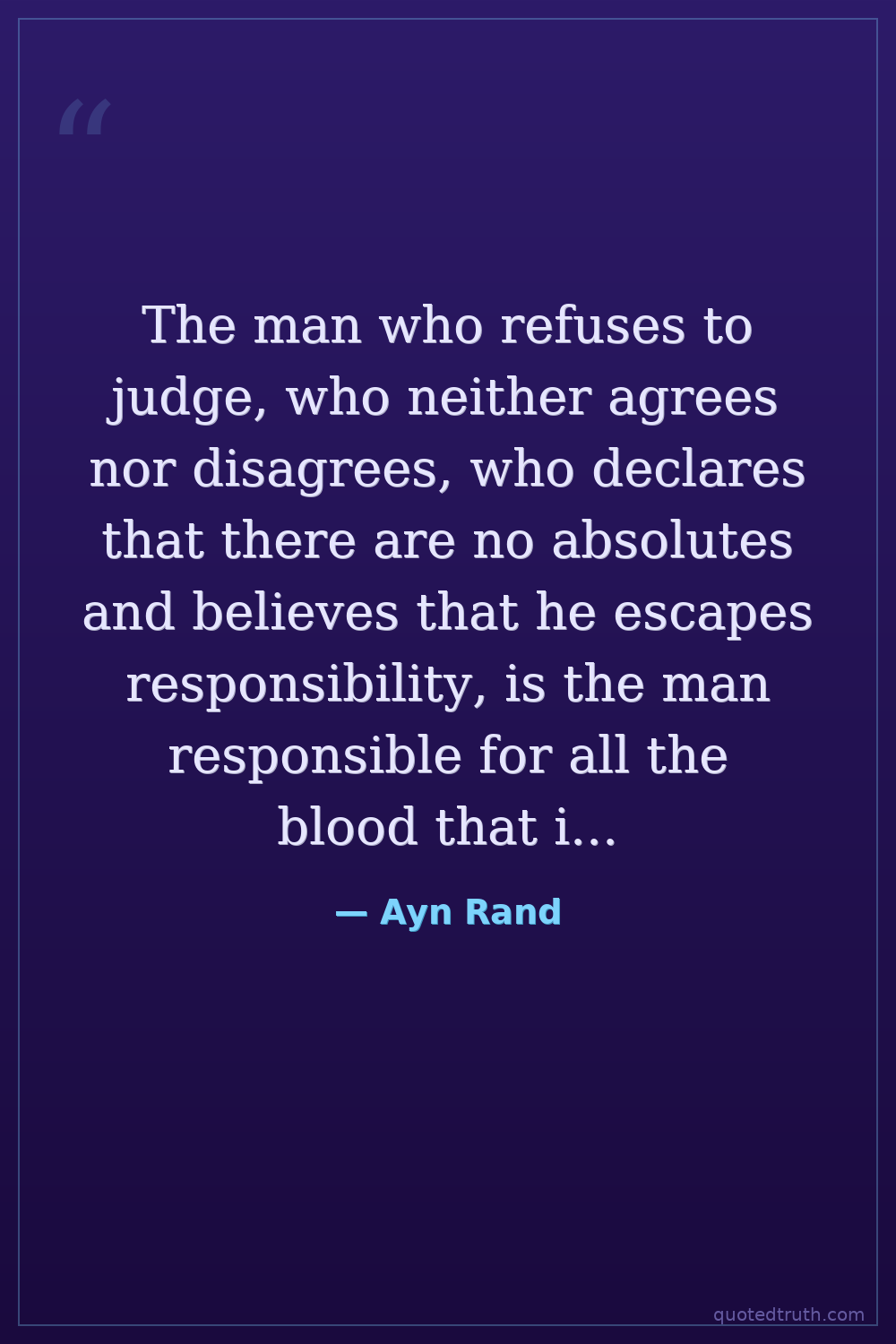 The man who refuses to judge, who neither agrees nor disagrees, who declares that there are no absolutes and believes that he escapes responsibility, is the man responsible for all the blood that is now spilled in the world. — Ayn Rand Modern Objectivism, Atlas Shrugged
