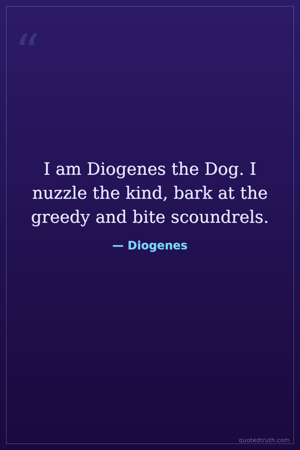 I am Diogenes the Dog. I nuzzle the kind, bark at the greedy and bite scoundrels.