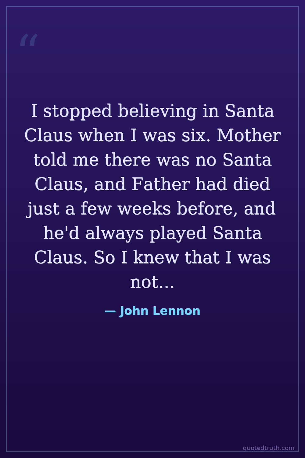I stopped believing in Santa Claus when I was six. Mother told me there was no Santa Claus, and Father had died just a few weeks before, and he'd always played Santa Claus. So I knew that I was not going to get a present from him anymore. — John Lennon Modern Beatles, peace activist