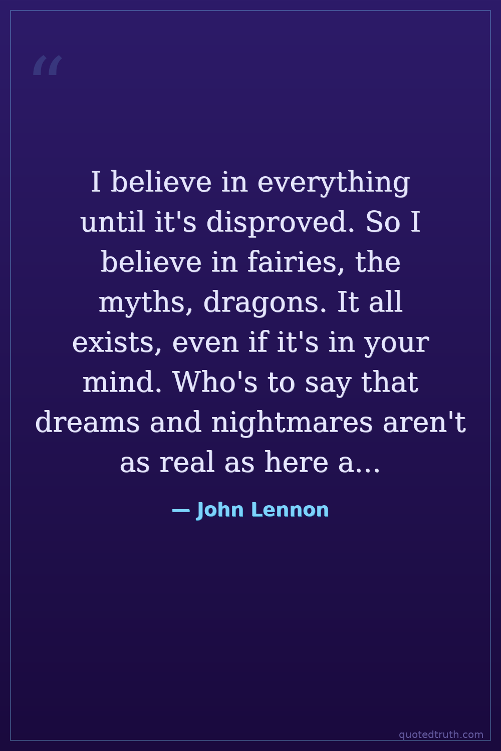 I believe in everything until it's disproved. So I believe in fairies, the myths, dragons. It all exists, even if it's in your mind. Who's to say that dreams and nightmares aren't as real as here and now?