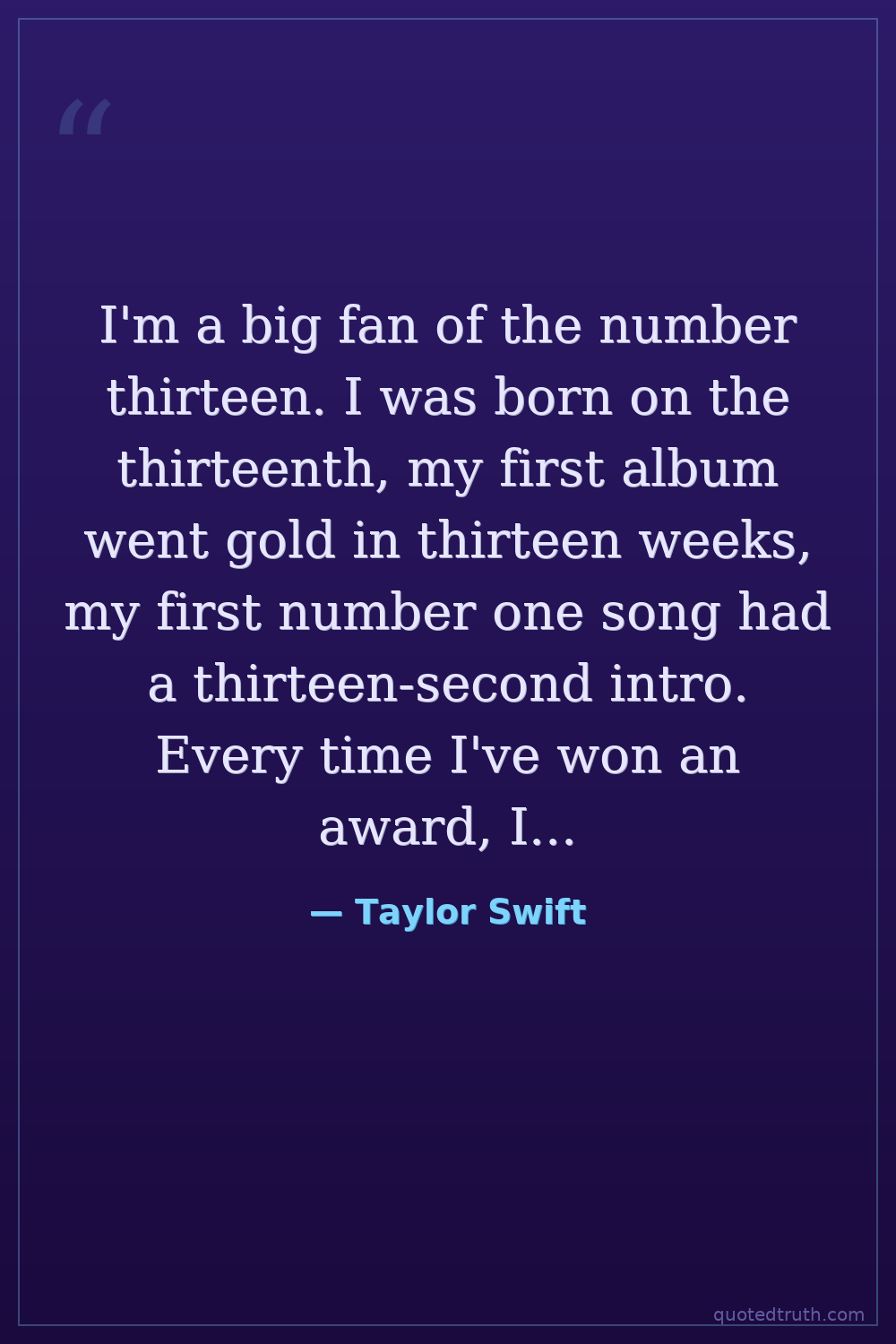 I'm a big fan of the number thirteen. I was born on the thirteenth, my first album went gold in thirteen weeks, my first number one song had a thirteen-second intro. Every time I've won an award, I've been seated in either the thirteenth row or the M section, which is the thirteenth letter of the alphabet. I've had thirteen on my hand for every show I've ever played.
