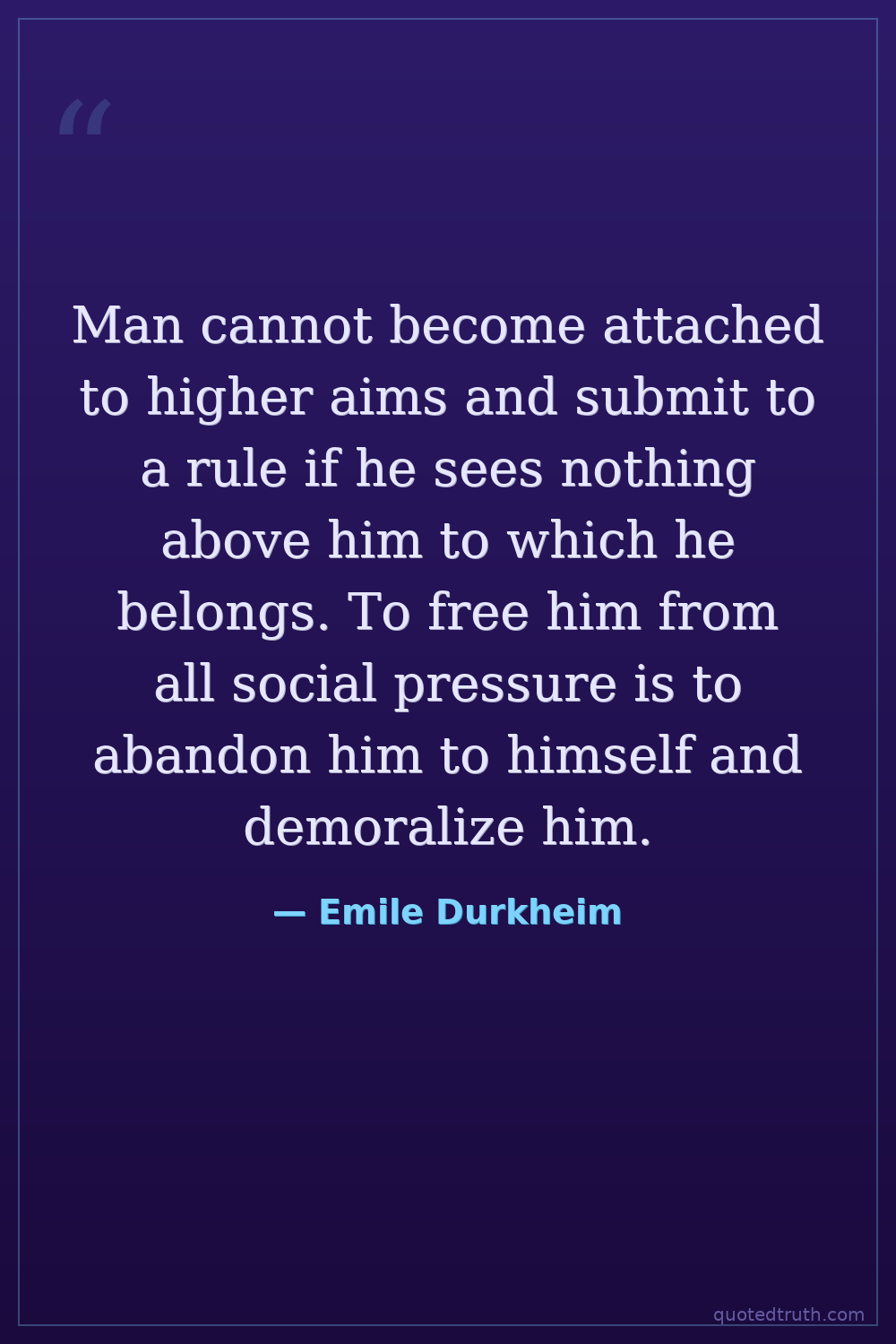 Man cannot become attached to higher aims and submit to a rule if he sees nothing above him to which he belongs. To free him from all social pressure is to abandon him to himself and demoralize him.