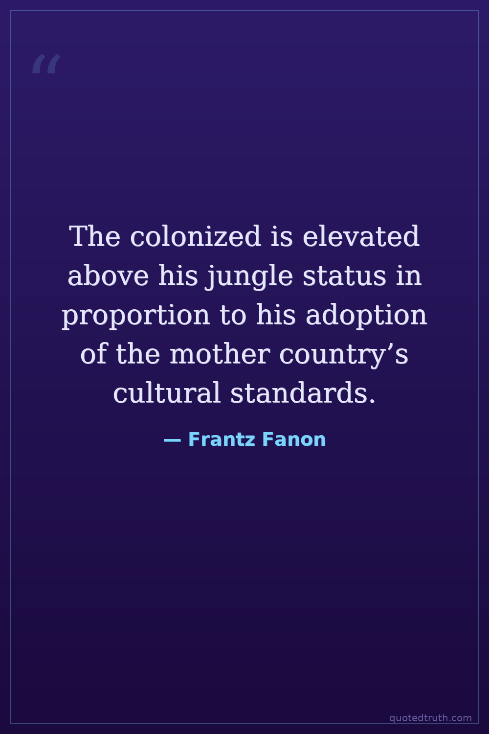 The colonized is elevated above his jungle status in proportion to his adoption of the mother country’s cultural standards.