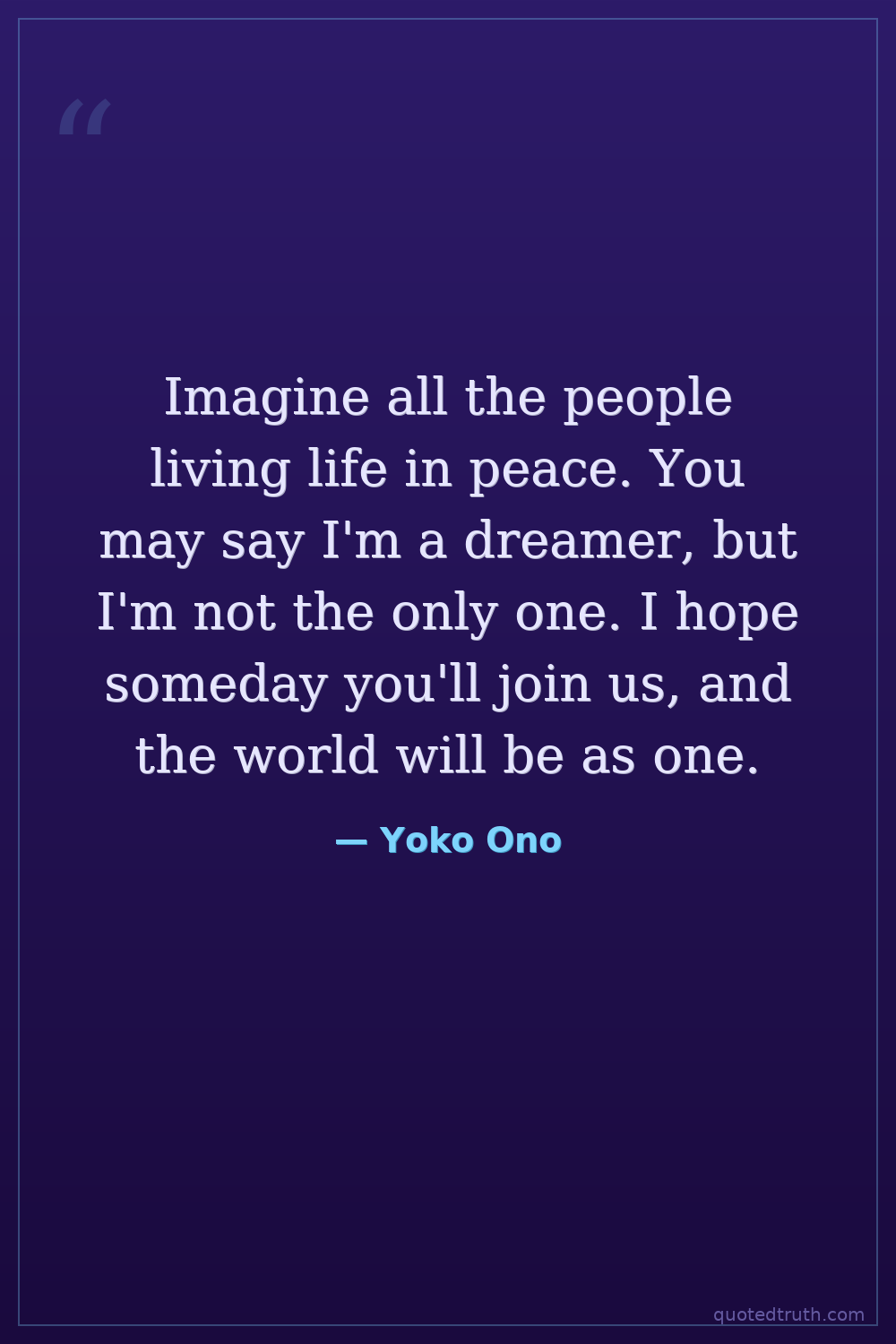 Imagine all the people living life in peace. You may say I'm a dreamer, but I'm not the only one. I hope someday you'll join us, and the world will be as one.