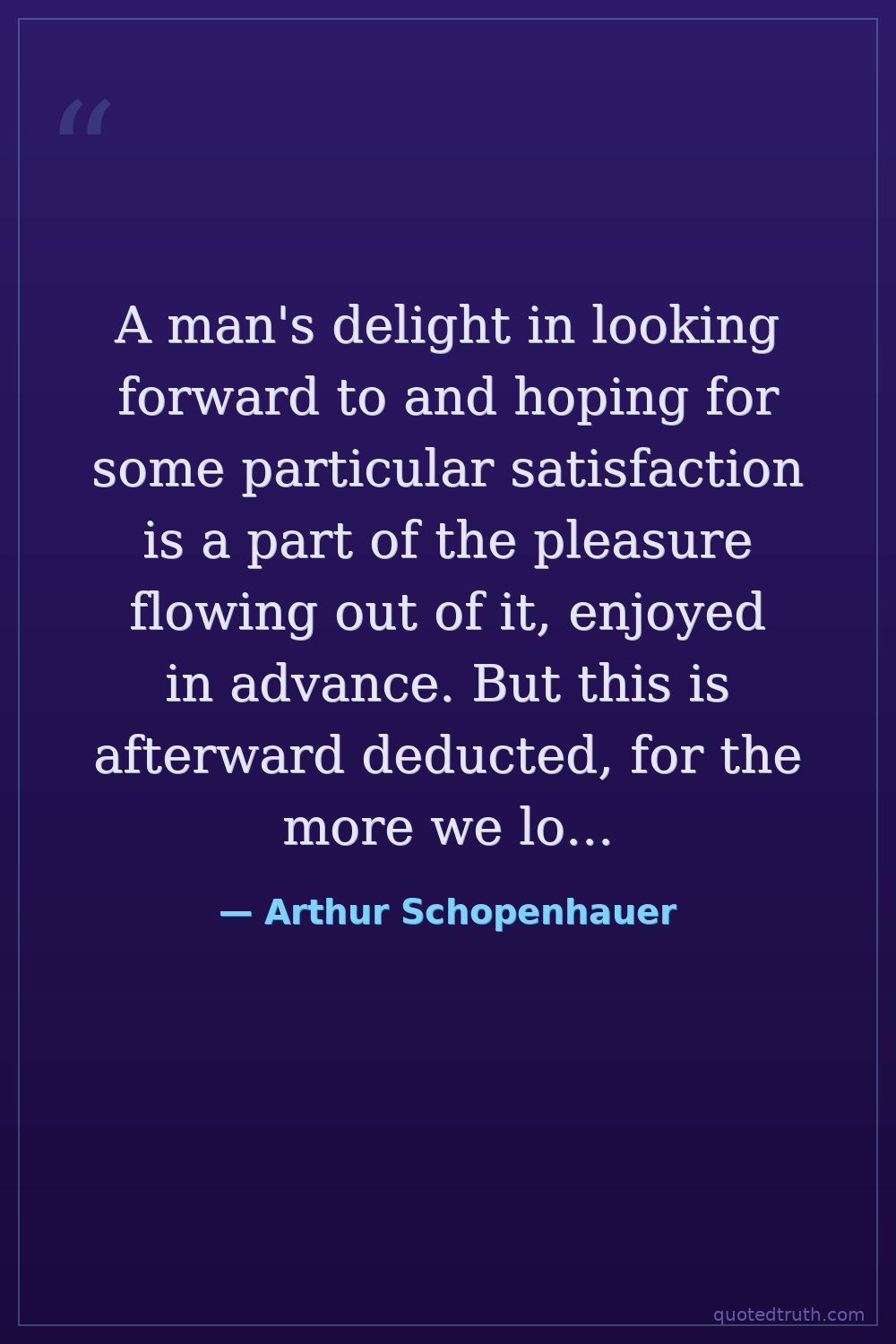 A man's delight in looking forward to and hoping for some particular satisfaction is a part of the pleasure flowing out of it, enjoyed in advance. But this is afterward deducted, for the more we look forward to anything the less we enjoy it when it comes.