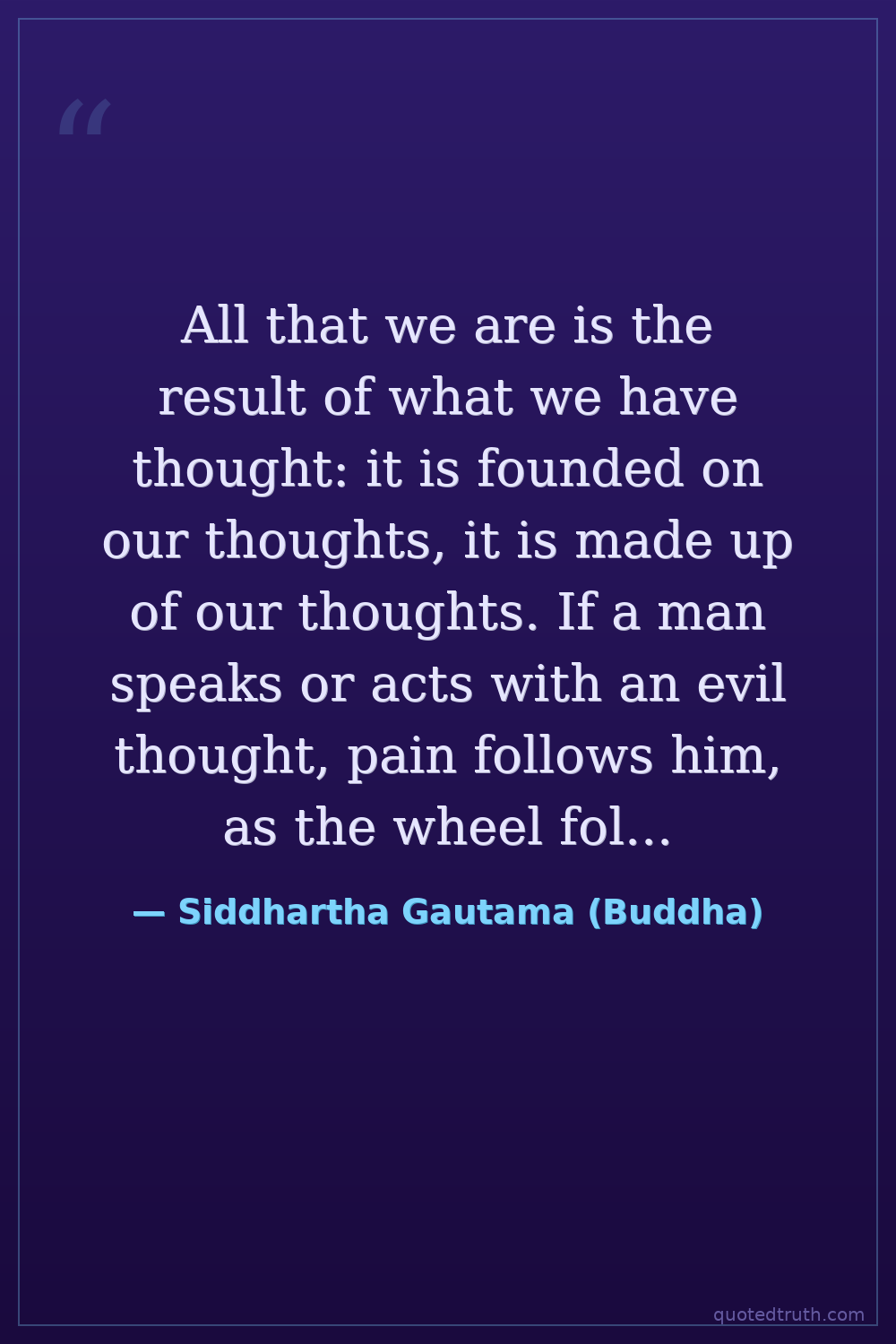 All that we are is the result of what we have thought: it is founded on our thoughts, it is made up of our thoughts. If a man speaks or acts with an evil thought, pain follows him, as the wheel follows the foot of the ox that draws the carriage.
