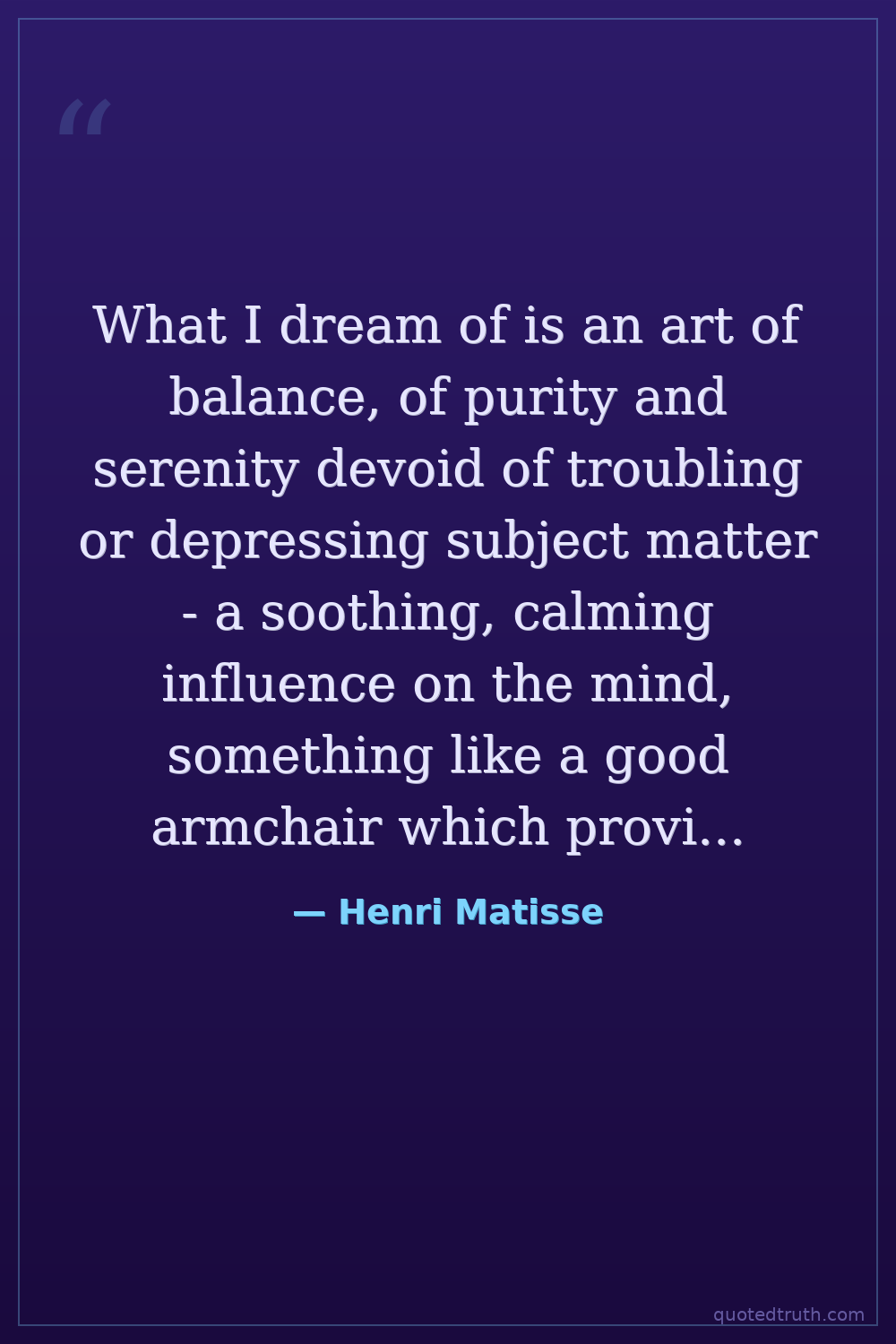 What I dream of is an art of balance, of purity and serenity devoid of troubling or depressing subject matter - a soothing, calming influence on the mind, something like a good armchair which provides relaxation from physical fatigue.
