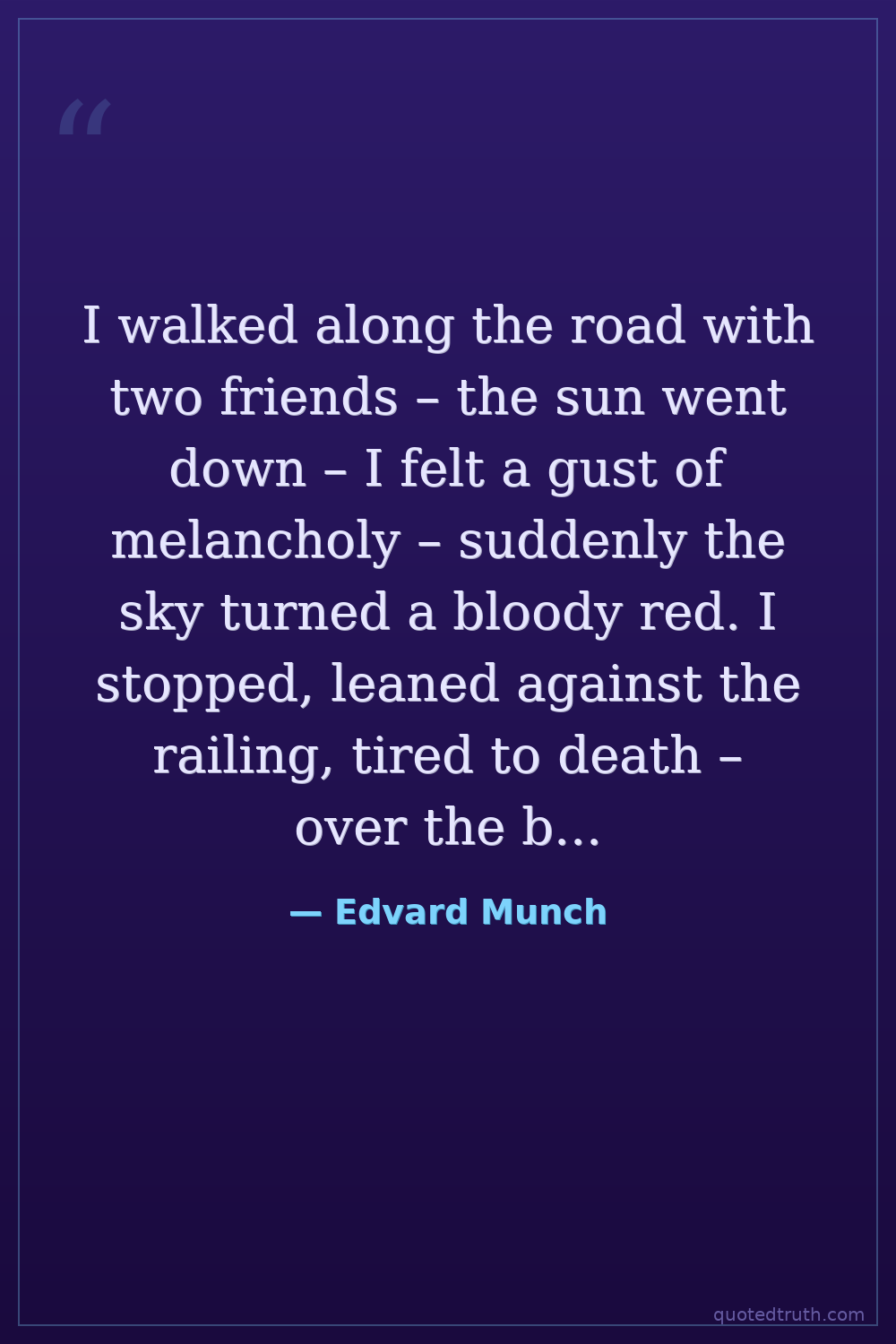 I walked along the road with two friends – the sun went down – I felt a gust of melancholy – suddenly the sky turned a bloody red. I stopped, leaned against the railing, tired to death – over the blue-black fjord and city hung blood and tongues of fire – My friends walked on, and I stood there trembling with anxiety – and I felt an endless scream passing through nature.