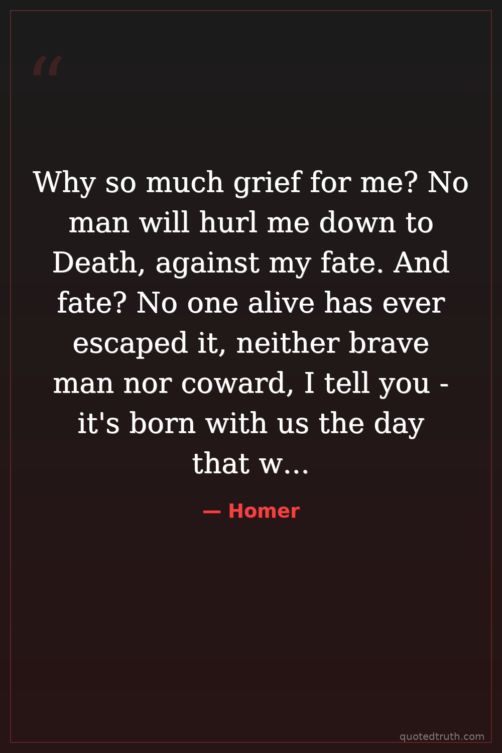 Why so much grief for me? No man will hurl me down to Death, against my fate. And fate? No one alive has ever escaped it, neither brave man nor coward, I tell you - it's born with us the day that we are born.