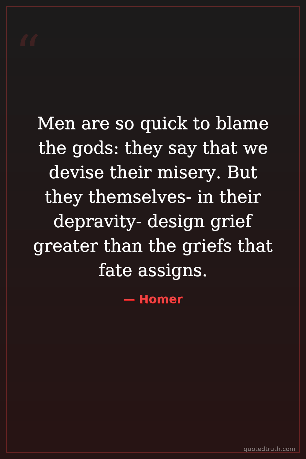 Men are so quick to blame the gods: they say that we devise their misery. But they themselves- in their depravity- design grief greater than the griefs that fate assigns.