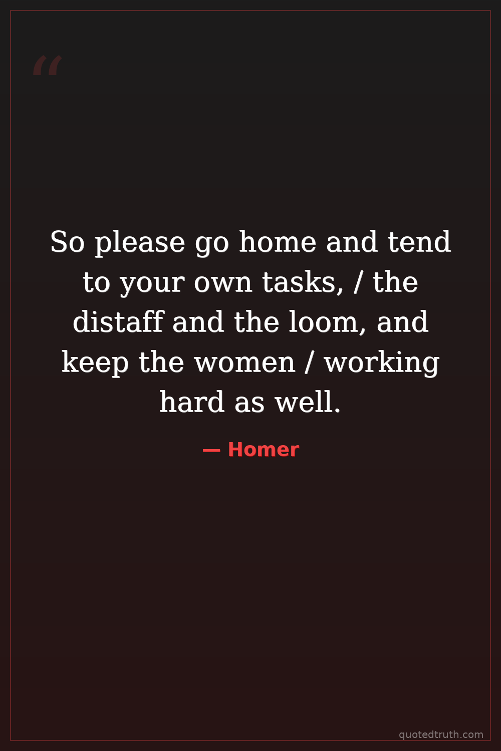 So please go home and tend to your own tasks, / the distaff and the loom, and keep the women / working hard as well.