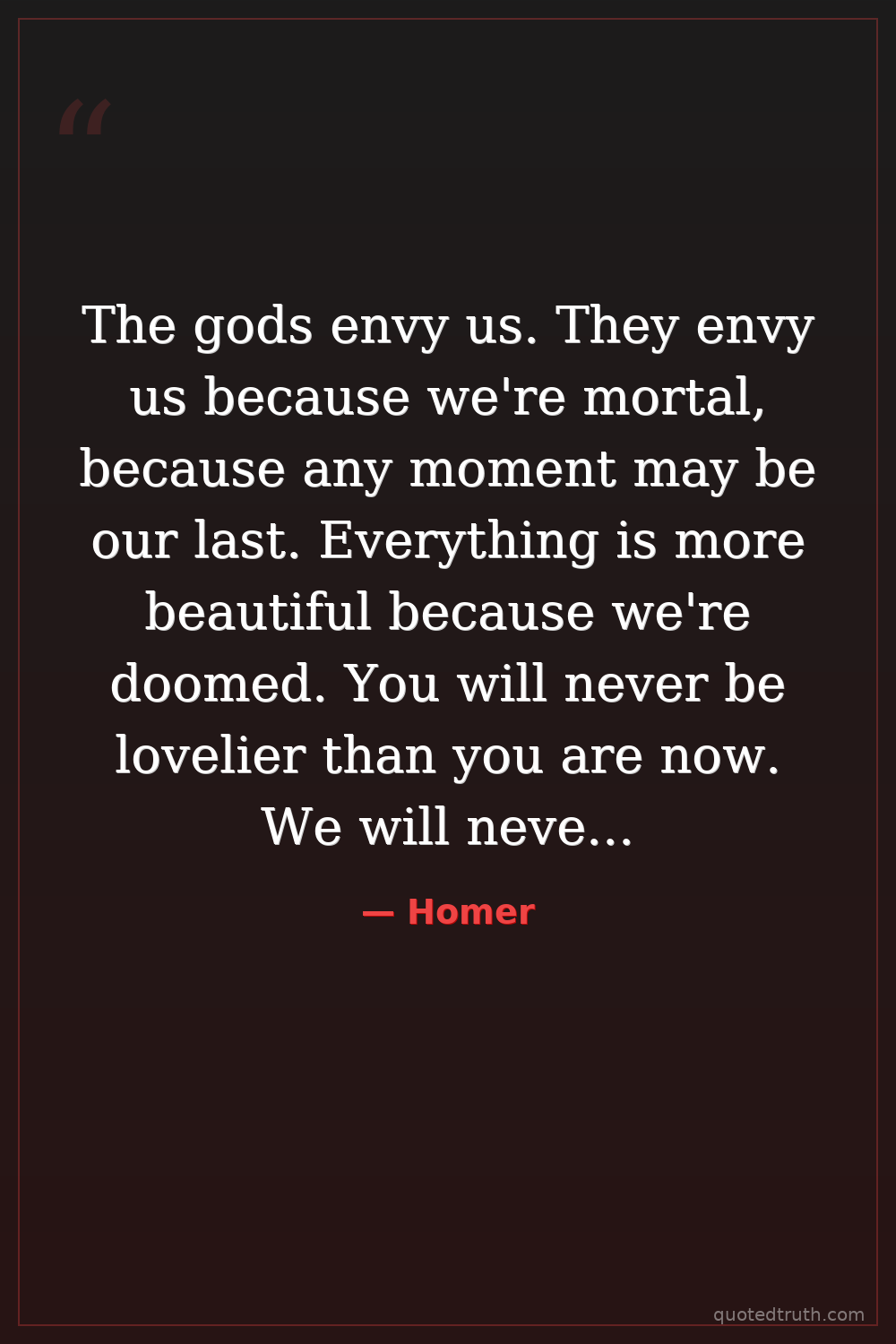 The gods envy us. They envy us because we're mortal, because any moment may be our last. Everything is more beautiful because we're doomed. You will never be lovelier than you are now. We will never be here again.