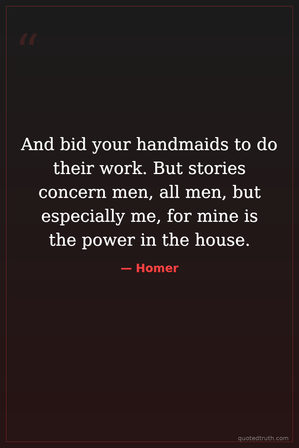 And bid your handmaids to do their work. But stories concern men, all men, but especially me, for mine is the power in the house.