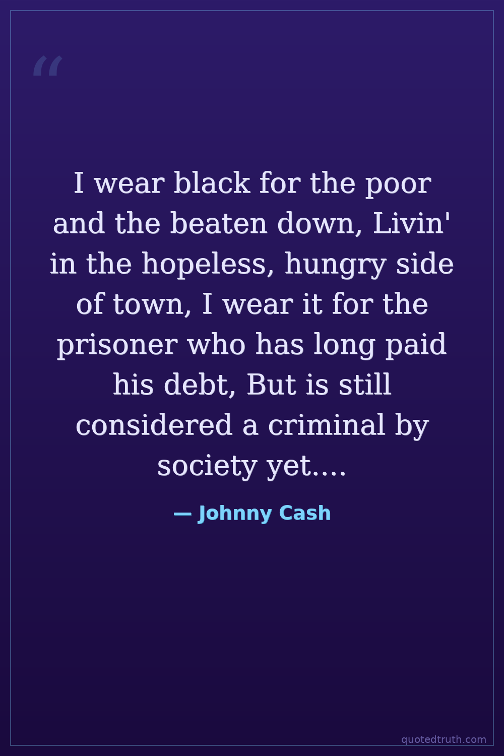 I wear black for the poor and the beaten down, Livin' in the hopeless, hungry side of town, I wear it for the prisoner who has long paid his debt, But is still considered a criminal by society yet. I wear black for the sick and the lonely, For the old and the crippled, the weak and the holy, I wear black for the ones who have never seen the light, The ones who have never known a day without night. I wear black for the ones who have nothing to lose, The ones who have nothing to gain, but still choose, To stand up and fight for what they believe is right, The ones who will never give up without a fight. I wear black for the ones who have lost their way, The ones who have strayed from the path, and gone astray, I wear black for the ones who are lost in the dark, The ones who are searching for a spark. I wear black for the ones who are hurting inside, The ones who are hiding their pain and their pride, I wear black for the ones who are broken and bruised, The ones who are weary and tired and confused. I wear black for the ones who are crying alone, The ones who are yearning for a place to call home, I wear black for the ones who are struggling to cope, The ones who are clinging to a glimmer of hope. I wear black for the ones who are feeling afraid, The ones who are burdened by the choices they've made, I wear black for the ones who are facing their fears, The ones who are shedding their silent tears. I wear black for the ones who are fighting for change, The ones who are trying to rearrange, The world into a place where everyone can be free, The ones who are striving for equality. I wear black for the ones who are making a stand, The ones who are holding a helping hand, I wear black for the ones who are showing their might, The ones who are shining their inner light.