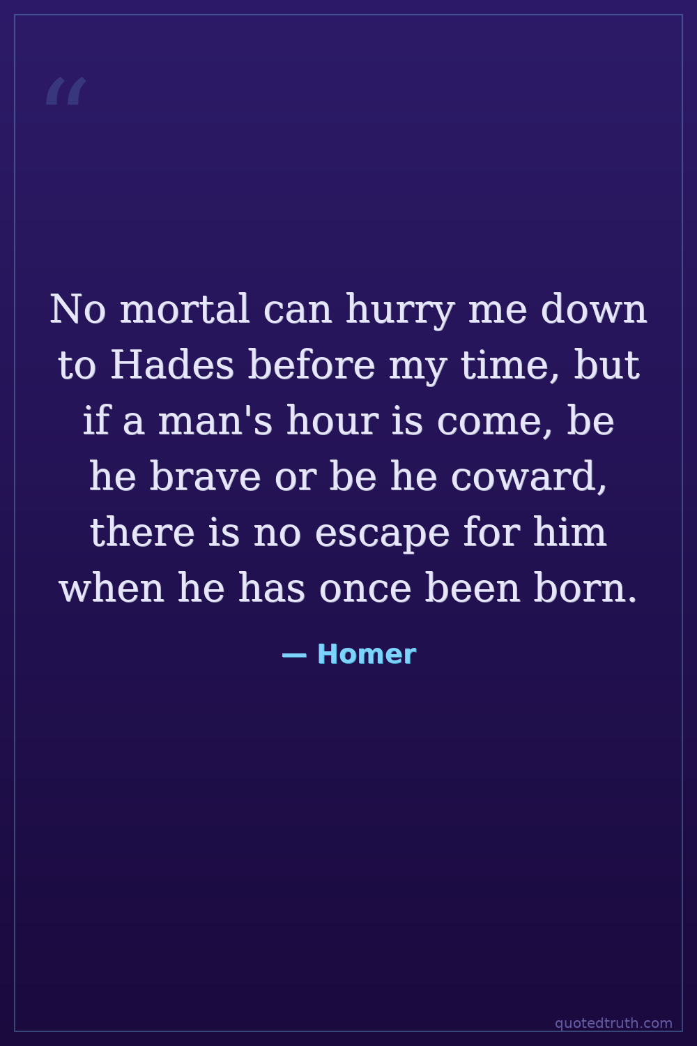 No mortal can hurry me down to Hades before my time, but if a man's hour is come, be he brave or be he coward, there is no escape for him when he has once been born.
