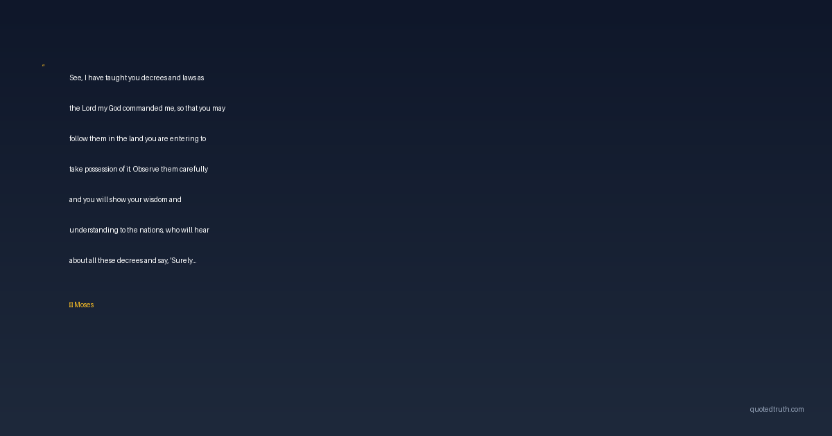 See, I have taught you decrees and laws as the Lord my God commanded me, so that you may follow them in the land you are entering to take possession of it. Observe them carefully and you will show your wisdom and understanding to the nations, who will hear about all these decrees and say, 'Surely this great nation is a wise and understanding people.'