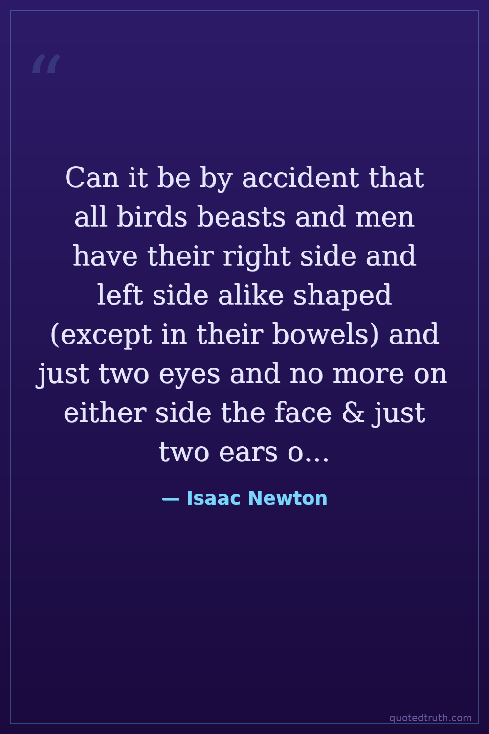 Can it be by accident that all birds beasts and men have their right side and left side alike shaped (except in their bowels) and just two eyes and no more on either side the face & just two ears on either side the head and a nose with two holes and no more between the eyes & one mouth under the nose and either two fore leggs or two wings or two arms on the sholders & two leggs on the hipps one on either side & no more?