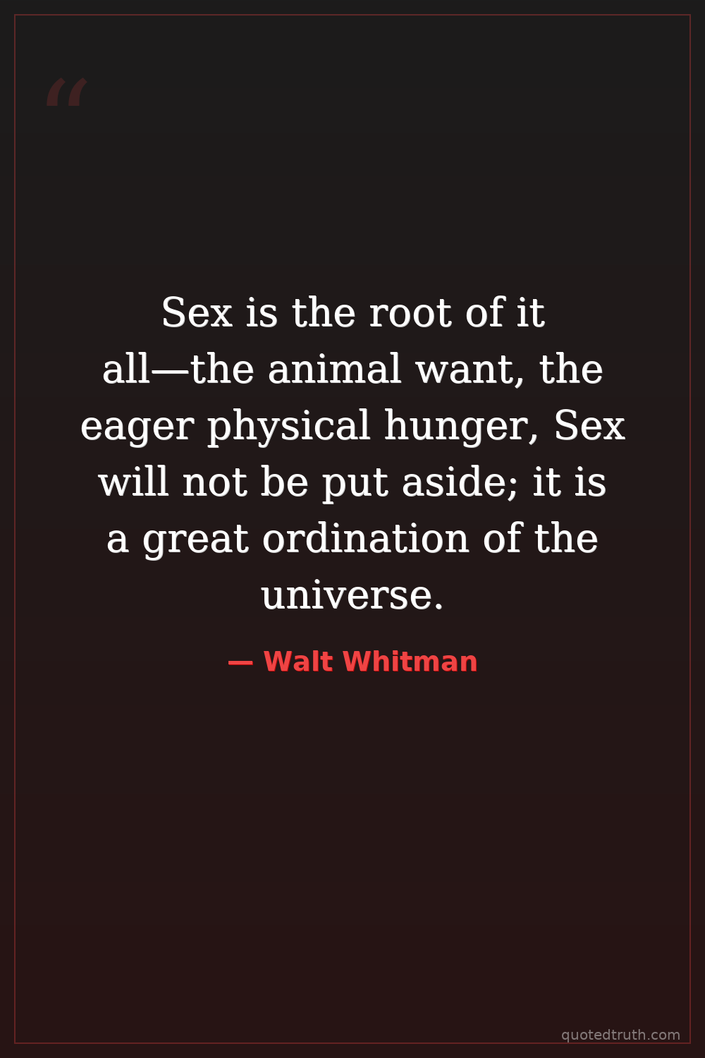 Sex is the root of it all—the animal want, the eager physical hunger, Sex will not be put aside; it is a great ordination of the universe.