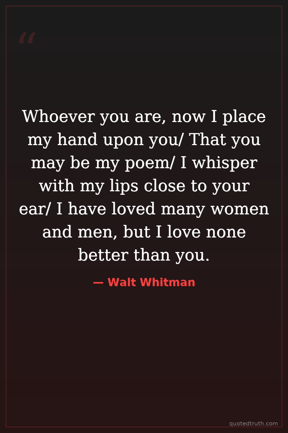 Whoever you are, now I place my hand upon you/ That you may be my poem/ I whisper with my lips close to your ear/ I have loved many women and men, but I love none better than you.