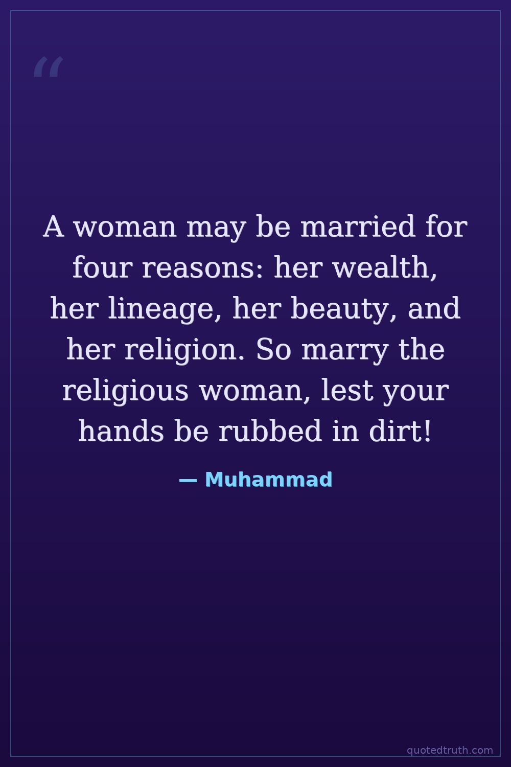 A woman may be married for four reasons: her wealth, her lineage, her beauty, and her religion. So marry the religious woman, lest your hands be rubbed in dirt!