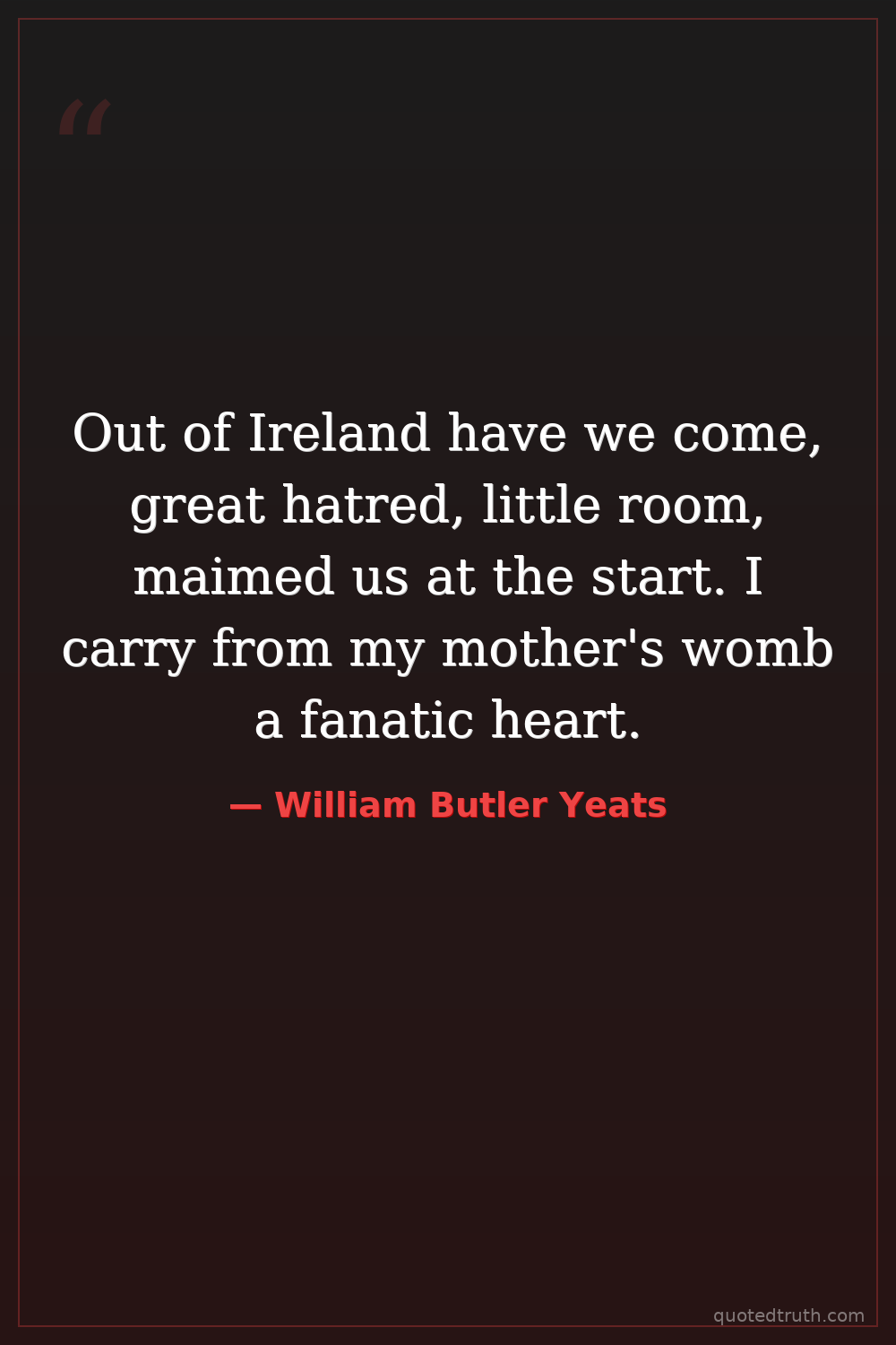 Out of Ireland have we come, great hatred, little room, maimed us at the start. I carry from my mother's womb a fanatic heart.