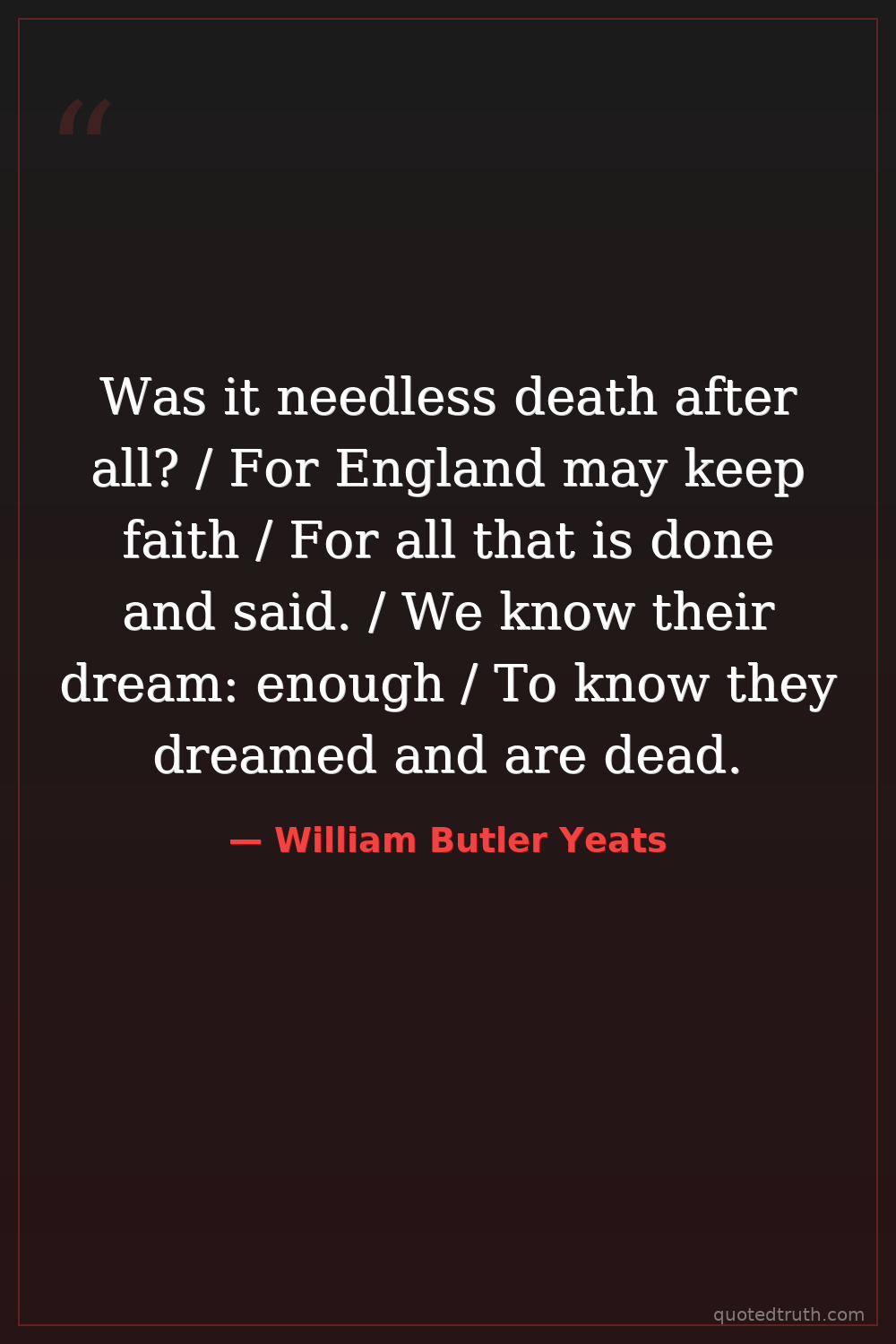 Was it needless death after all? / For England may keep faith / For all that is done and said. / We know their dream: enough / To know they dreamed and are dead.