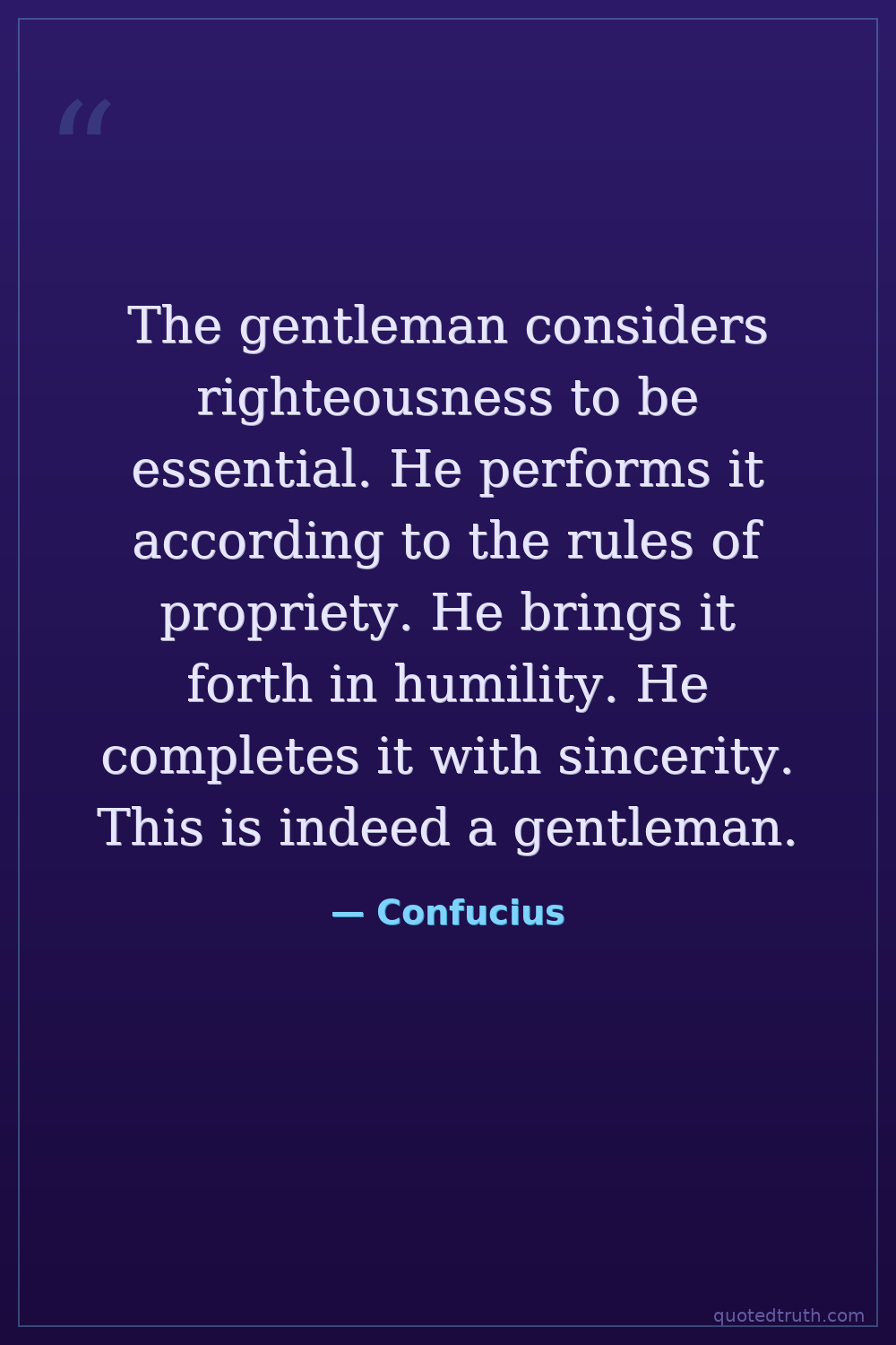 The gentleman considers righteousness to be essential. He performs it according to the rules of propriety. He brings it forth in humility. He completes it with sincerity. This is indeed a gentleman.