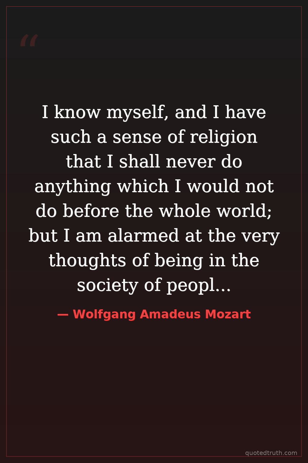 I know myself, and I have such a sense of religion that I shall never do anything which I would not do before the whole world; but I am alarmed at the very thoughts of being in the society of people, during my journey, whose mode of thinking is so entirely different from mine (and from that of all good people).