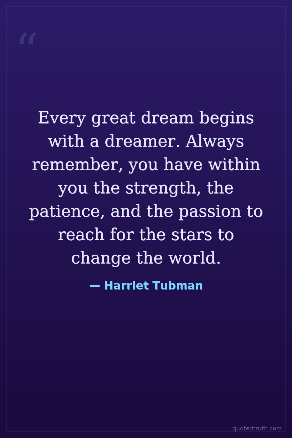 Every great dream begins with a dreamer. Always remember, you have within you the strength, the patience, and the passion to reach for the stars to change the world.
