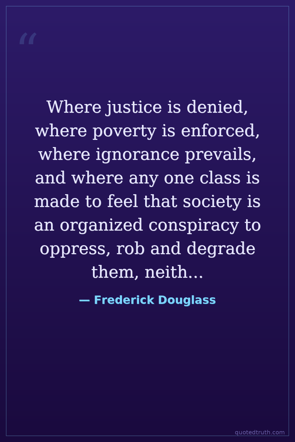 Where justice is denied, where poverty is enforced, where ignorance prevails, and where any one class is made to feel that society is an organized conspiracy to oppress, rob and degrade them, neither persons nor property will be safe. — Frederick Douglass Modern Abolitionist, orator