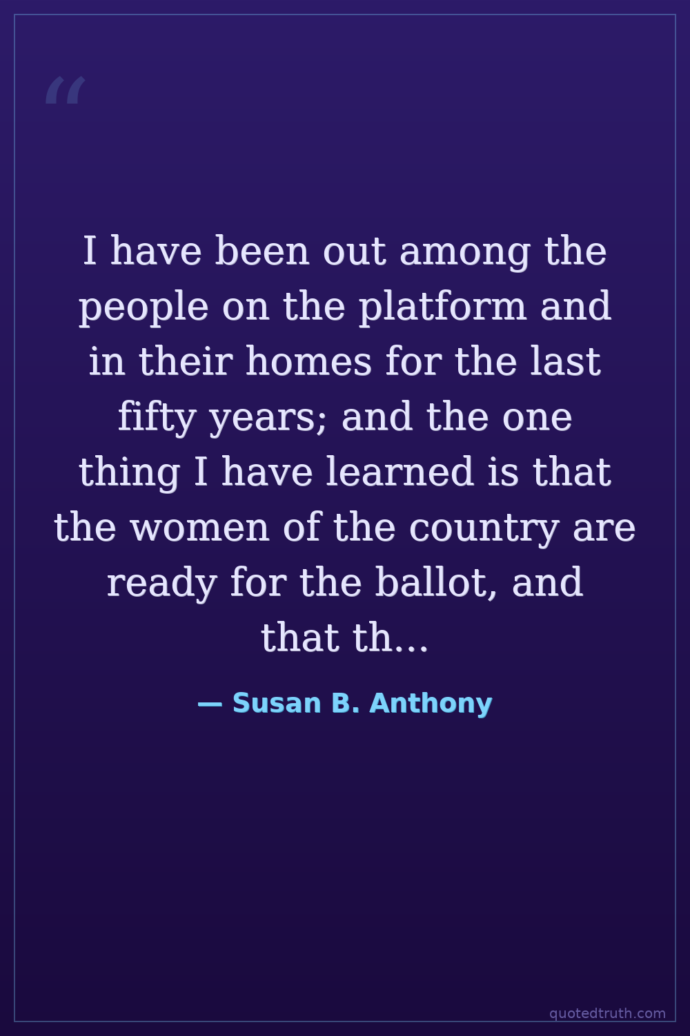 I have been out among the people on the platform and in their homes for the last fifty years; and the one thing I have learned is that the women of the country are ready for the ballot, and that they will have it.