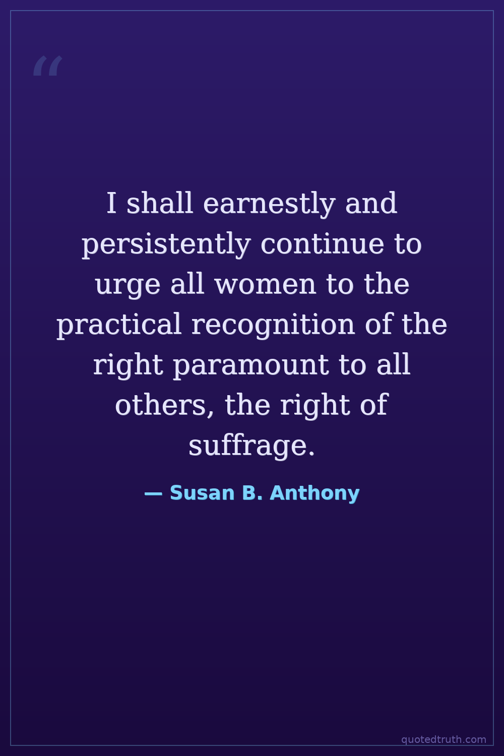 I shall earnestly and persistently continue to urge all women to the practical recognition of the right paramount to all others, the right of suffrage.